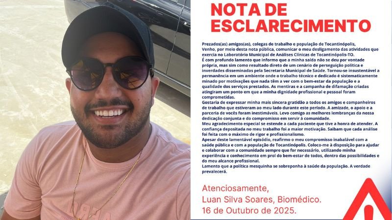 O biomédico Luan Silva Soares divulgou uma nota pública de esclarecimento comunicando seu desligamento das atividades que exercia no Laboratório Municipal de Análises Clínicas de Tocantinópolis (TO).