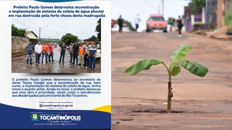 Cansados de décadas de descaso e de promessas não cumpridas, moradores da Rua Sergipe, no setor Dergo, em Tocantinópolis, realizaram um protesto inusitado no último domingo (08): plantaram uma bananeira em um dos inúmeros buracos causados pela enxurrada que atinge a via nos períodos de chuva.