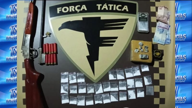 Durante a abordagem, foram descobertas porções de uma substância semelhante à maconha. Questionados, os adolescentes revelaram o local de origem dos entorpecentes. As guarnições seguiram para o endereço indicado, onde localizaram o suspeito principal. Após uma busca minuciosa, foram encontradas grandes quantidades de drogas — cerca de 400 gramas de maconha e 26 gramas de cocaína — além de uma espingarda calibre .22/.32 e 14 munições intactas.