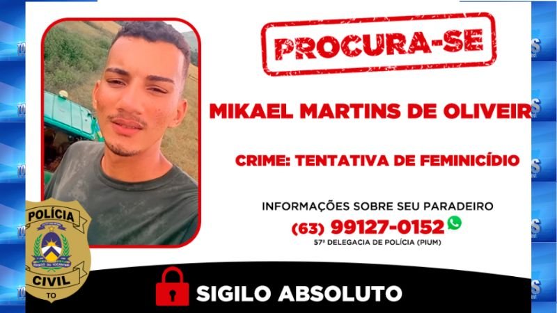 A Polícia Civil do Tocantins está em busca de Mikael Martins de Oliveira, suspeito de tentativa de feminicídio contra sua companheira na cidade de Pium.