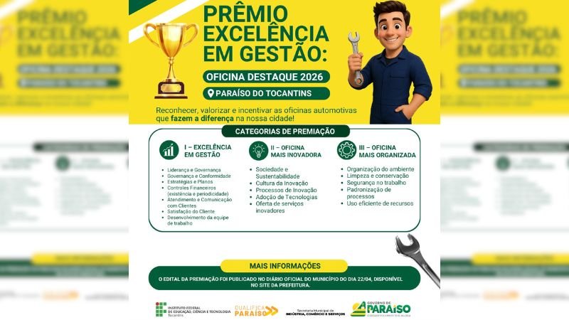 A Prefeitura de Paraíso do Tocantins, por intermédio da Secretaria Municipal de Indústria, Comércio e Serviços (SICS) através do Programa Qualifica Paraíso, em parceria com o Instituto Federal do Tocantins (IFTO) – Campus Paraíso, publicou no Diário Oficial nº 1.233/2026, em 22 de abril, o Edital nº 01/2026/SICS, que institui o Prêmio Excelência em Gestão: Oficina Destaque 2026. O objetivo é reconhecer, valorizar e incentivar a qualificação das oficinas automotivas do município, setor de relevância econômica e social para a cidade.