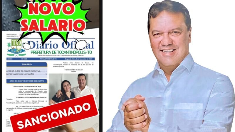 Na última segunda-feira (09) foi publicada no Diário Oficial de Tocantinópolis a Lei nº 1.234, de autoria da vereadora Josedilma Milhomem, que altera o anexo único da Lei Municipal nº 1.185/13‑12‑2024 e fixa os subsídios do alto escalão municipal: prefeito R$ 23.683,21; vice‑prefeito R$ 11.819,10; secretários R$ 8.864,31.