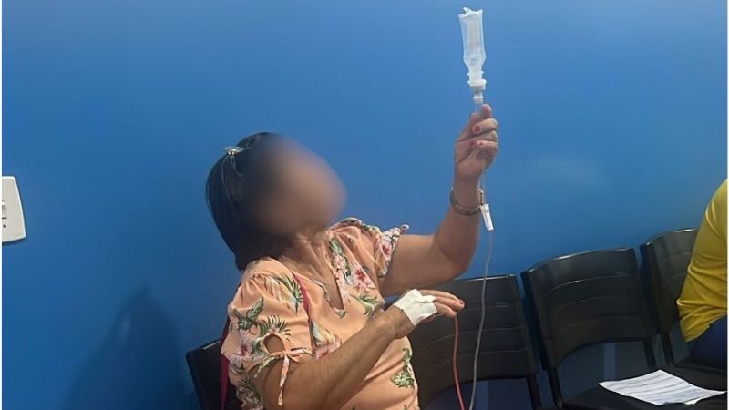 Nesta quinta-feira (06), o filho de uma moradora local divulgou em um grupo de WhatsApp da cidade a foto de sua mãe sendo atendida na UPA e tendo que segurar o soro com as próprias mãos, por falta de suporte adequado.
